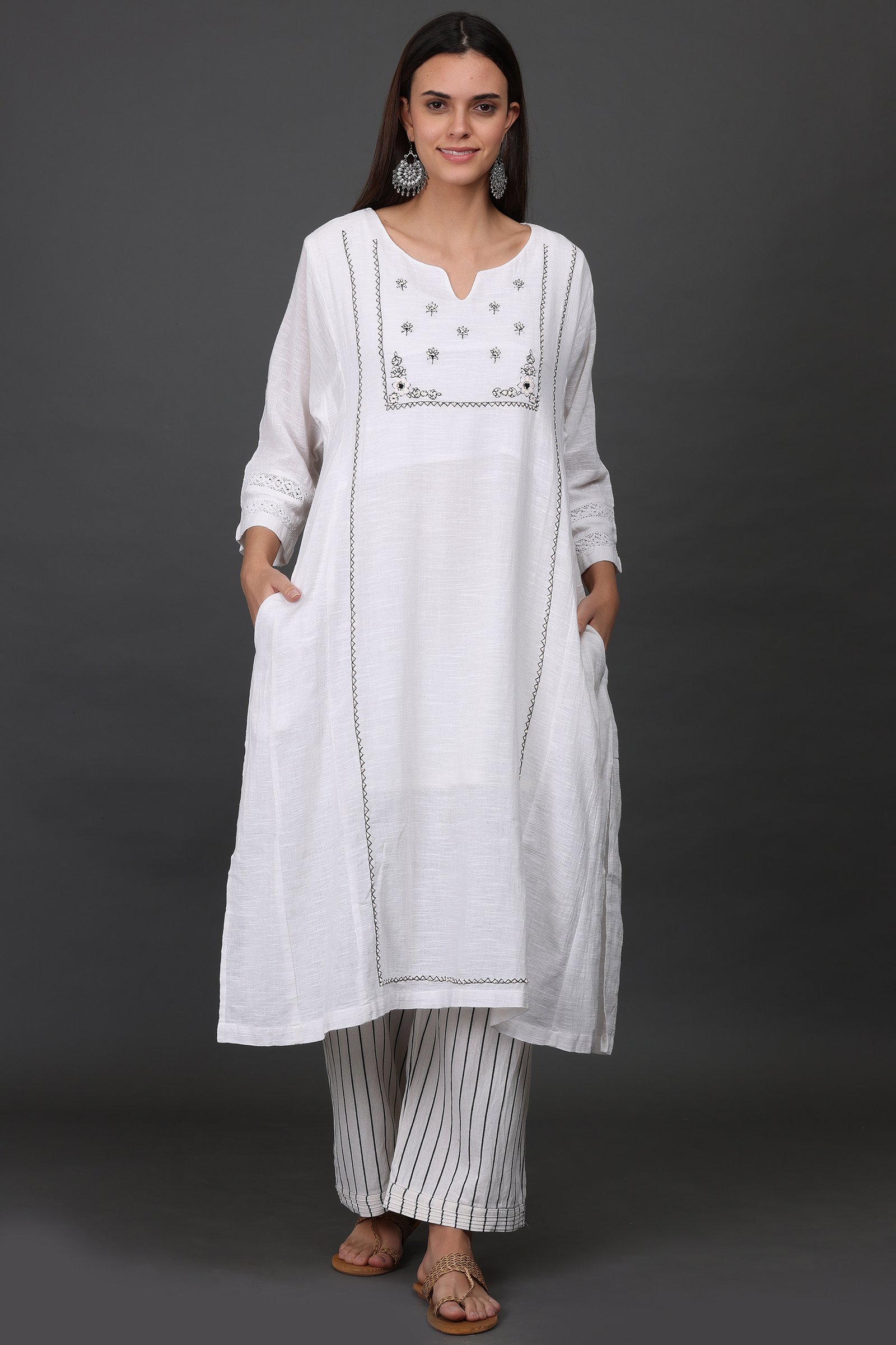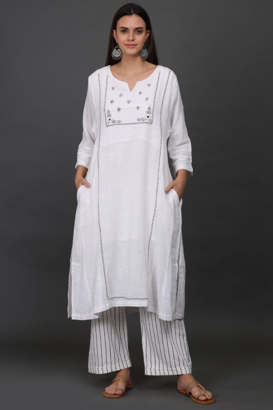 COTON LINEN V NECK HAND EMBROIDERED A LINE KURTA