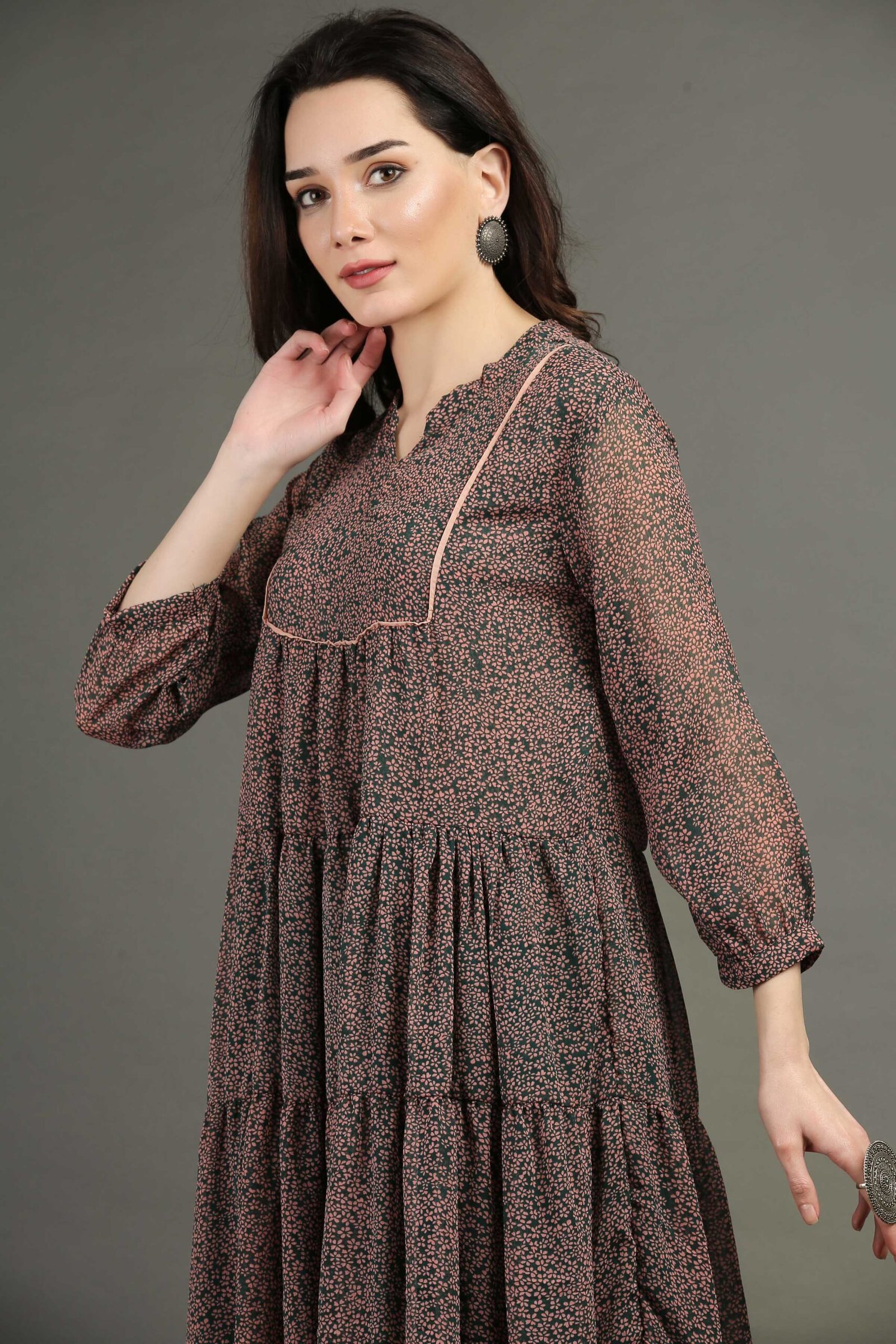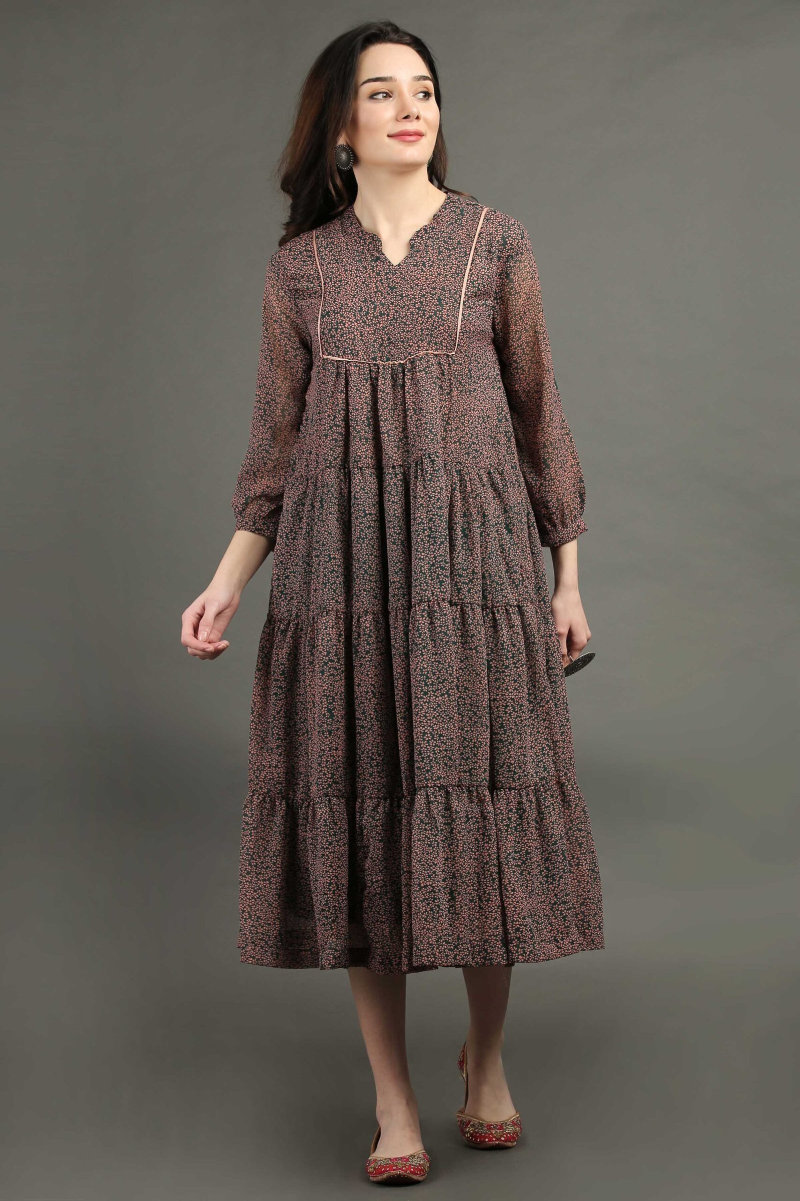 < class="product-title">Printed Floral Tired Chiffon Dress>