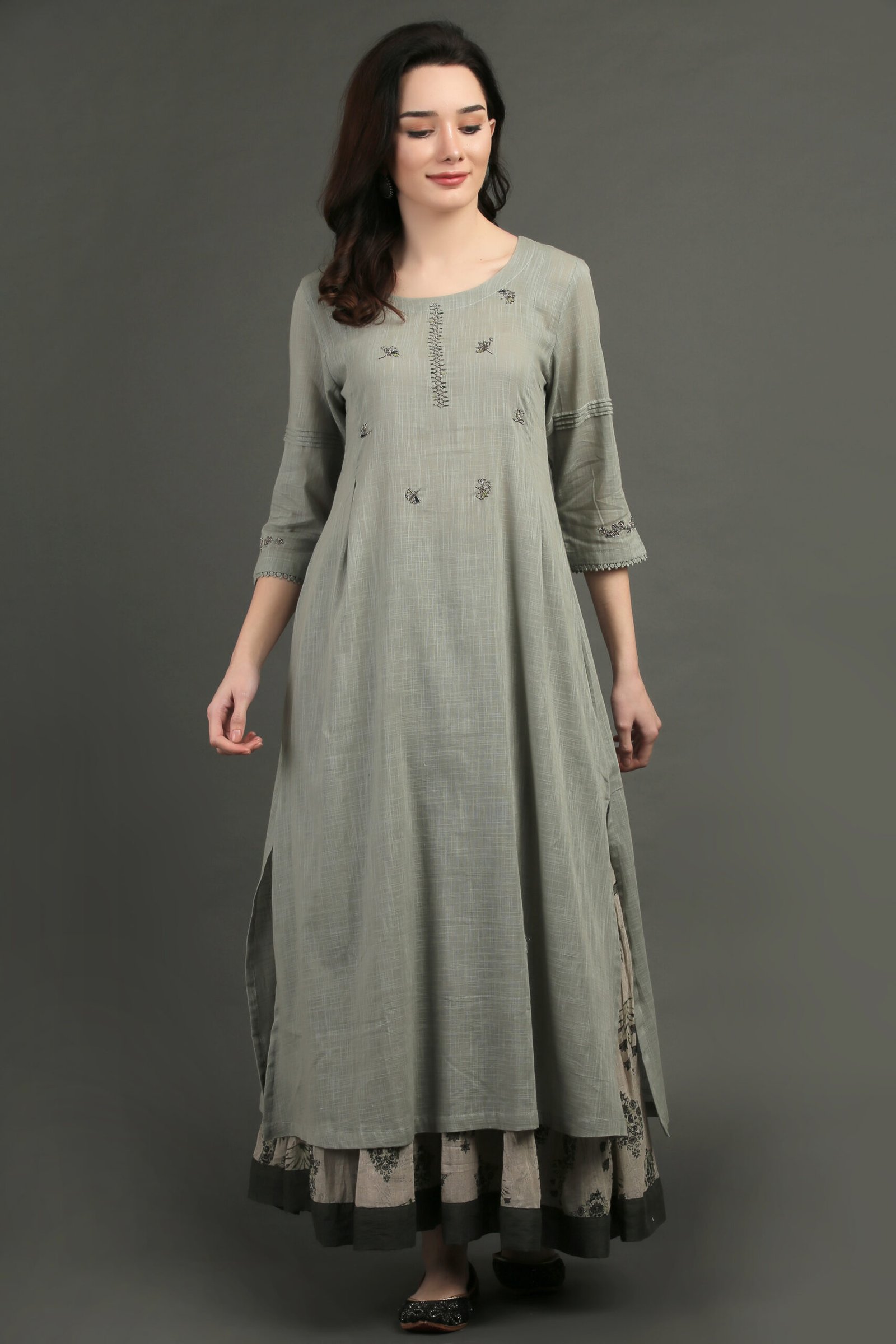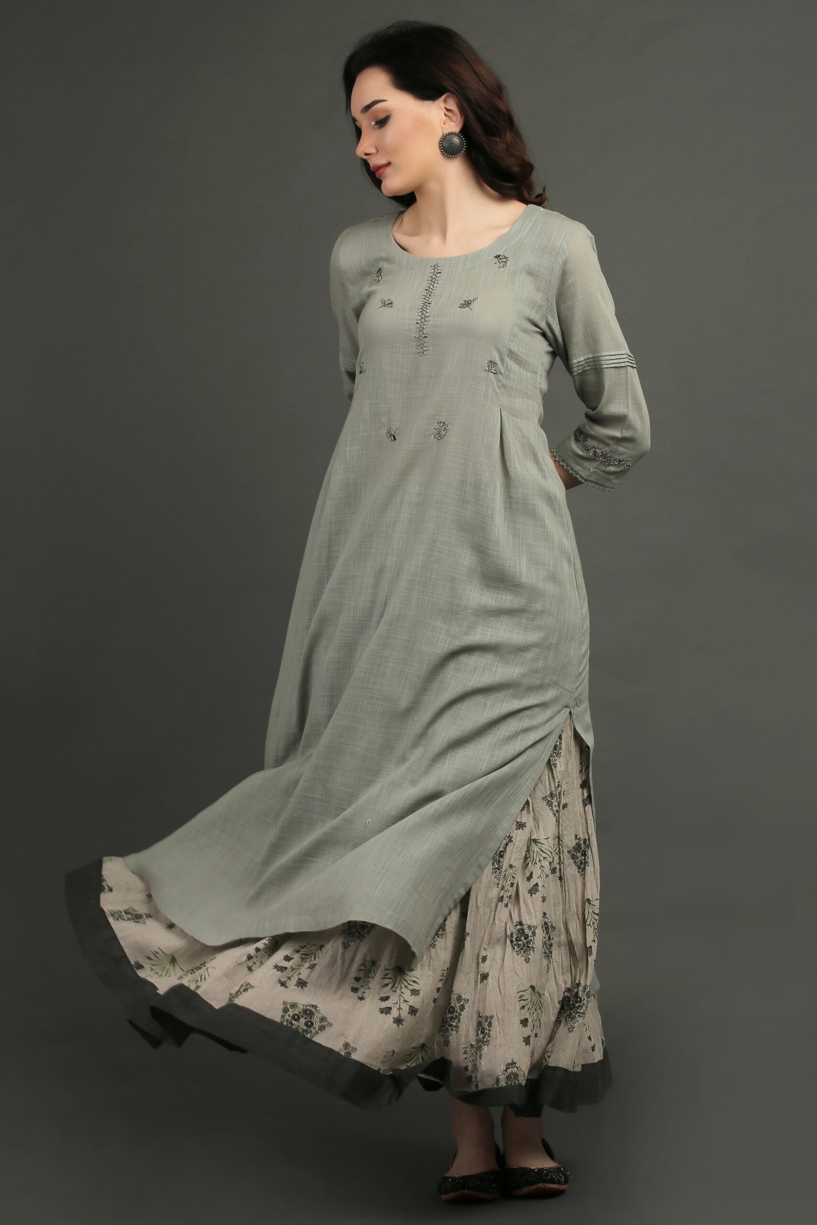 < class="product-title">Cotton Slub Hand Embroidered Kurta With Prined Cotton Crinkled Skirt (Set Of 2)>